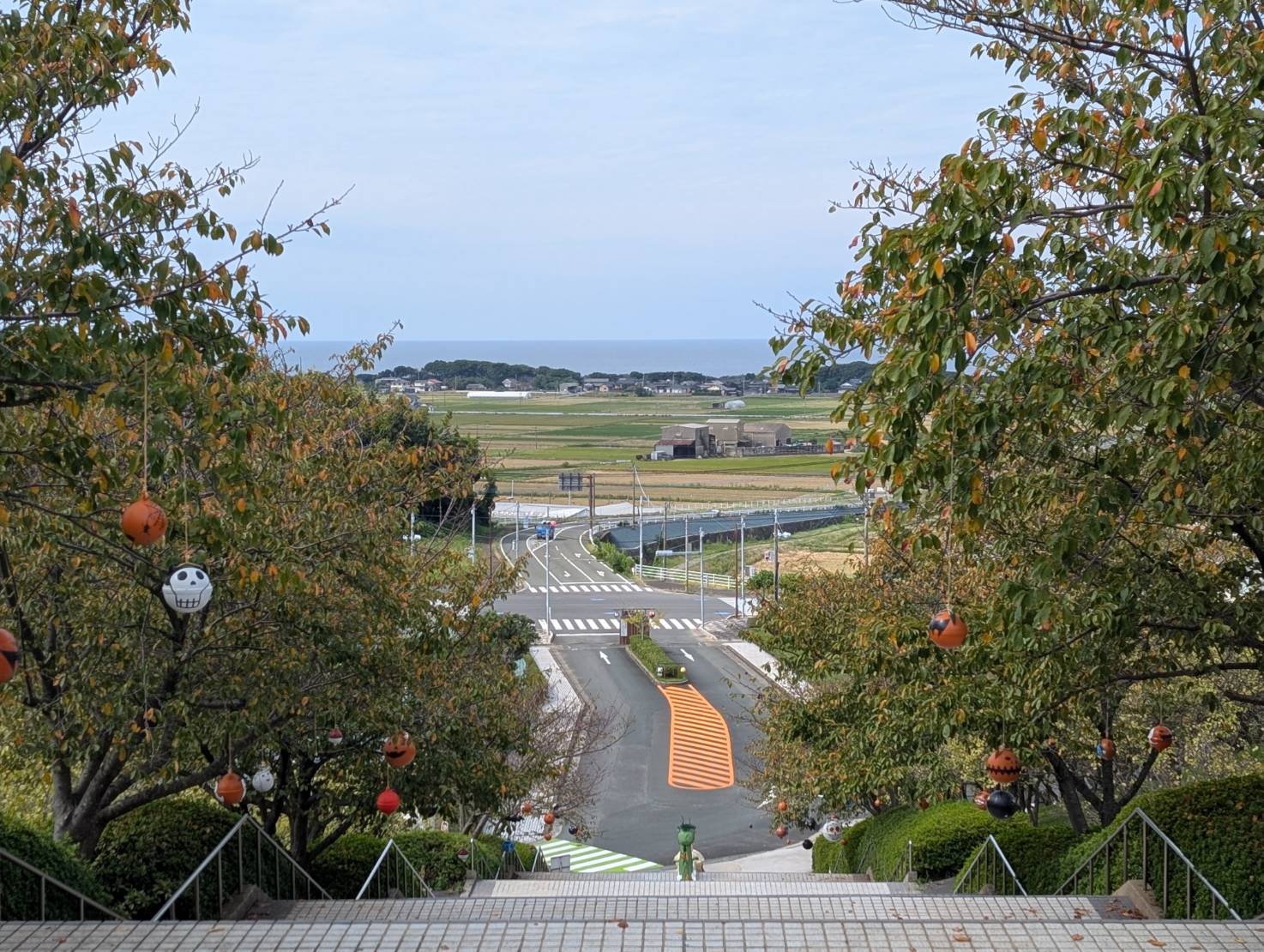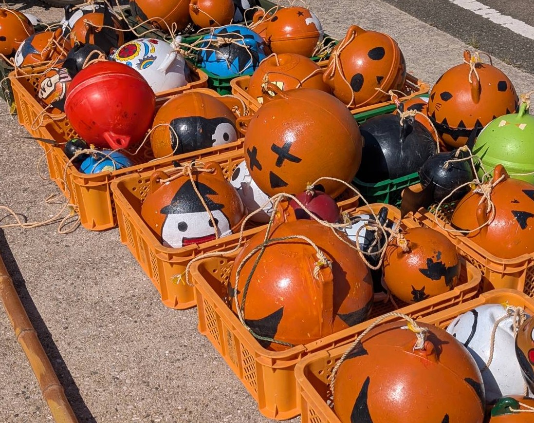 海洋ゴミをハロウィーン飾りへアップサイクルして、あんずの里運動公園の中央階段を装飾しています。